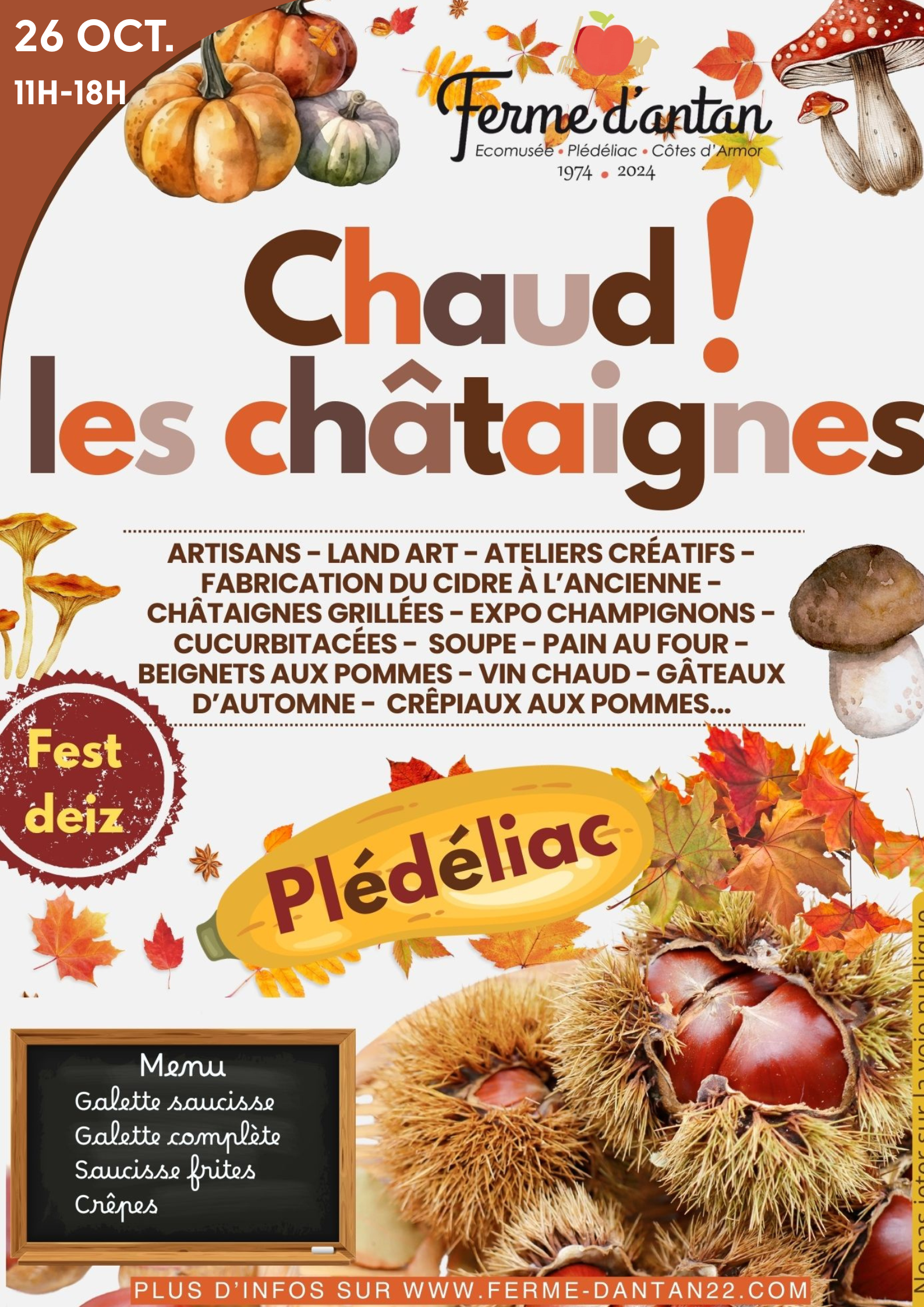 "Chaud! les châtaignes" : Dimanche 26 octobre 2025 de 11h à 18h à La Ferme d'antan, prix d'entrée 5€ par personne et gratuit pour les moins de 12 ans.