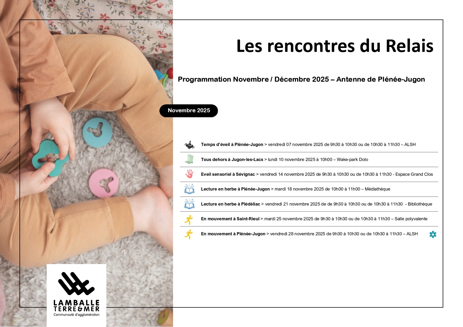 Découvrez le programme des animations du Relais Petite Enfance - Antenne de Plénée-Jugon pour la période de novembre / décembre 2025.